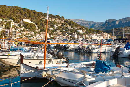 Puerto de Soller, Port of Mallorca island in balearic islands, Spain. Beautiful picture of boats in clear blue water of bright summer day.