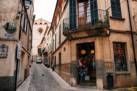 Soller, Mallorca, Spain - Jan 19, 2019: Old town street in the historical center of the Spanish city with the church of Sant Bartomeu in the background. Popular tourist destination in winter season.