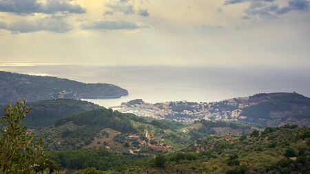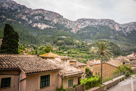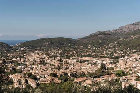 View of Soller panorama in Mallorca island, Spain. View of the mountains and coniferous forest. Panoramic view of the historical city in Mallorca island from Spain