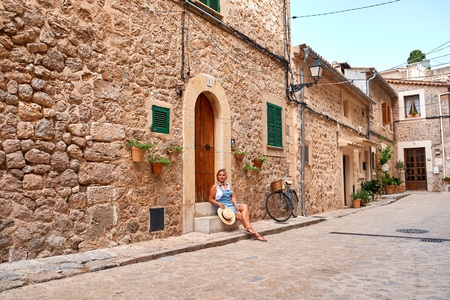 View of a medieval street of the picturesque Spanish-style village Valdemossa in Majorca or Mallorca island, Spain.