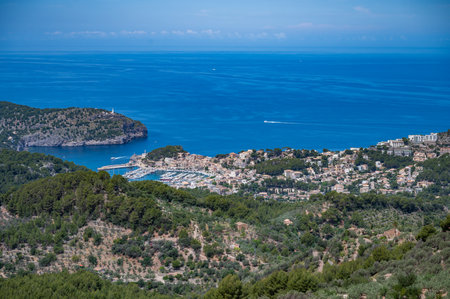 Port Soller, Mallorca. a picturesque coastal town nestled between lush green hills and the Mediterranean Sea, featuring a marina and historic buildings, Majorca