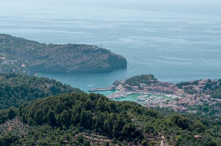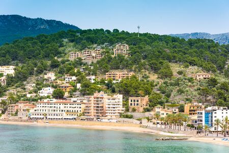 Port Soller Mallorca, view from the distance with the bay, cityscape, sea in the background, horizontal shot, majorca