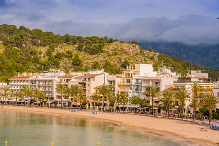 Panoramic view of Port de Soller with harbour, yachts, tourist boats, colorful architecture and beach on a cloudy day. Landmark of Mallorca, Spain