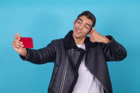 young man with mobile phone isolated on color background