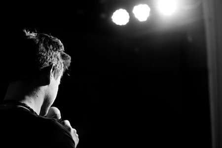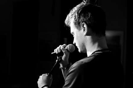 Young handsome guy emotionally sings and speaks into the microphone. Black and white photography