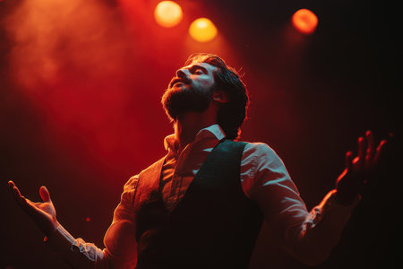 Silhouette of a singer in the spotlight, arms wide open, with stage lights creating a powerful and emotional scene