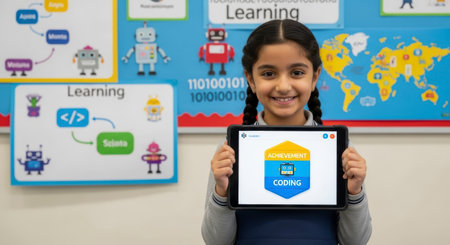 Young girl in school uniform holds a tablet displaying a learning app. Classroom setting with educational posters and learning resources visible in the background.