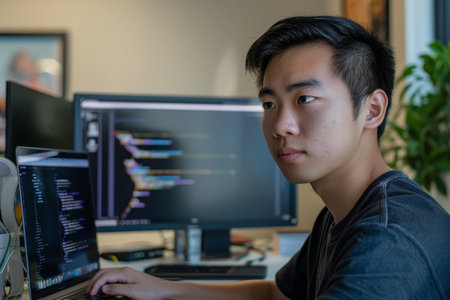 Man freelancer is working at home. Programmer is coding. Programming screen.