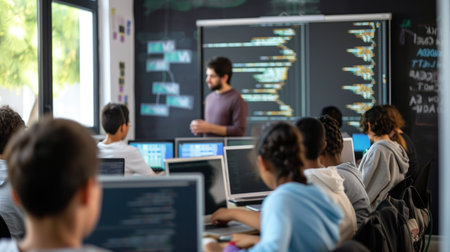 A mentor provides hands-on programming guidance to attentive young students, fostering early education in technology. AIG41