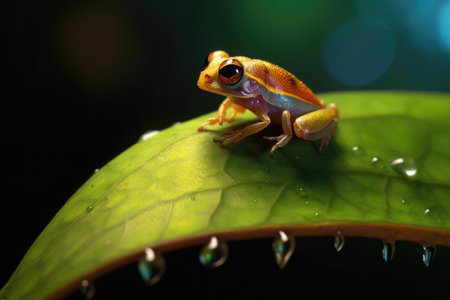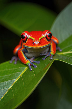Tiny red frog perched on a vibrant green leaf: A colorful jewel of the rainforest, its minute size and striking hue add a burst of wonder to the lush foliage of Costa Rica's tropical realm