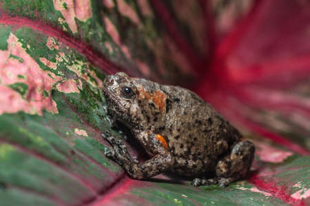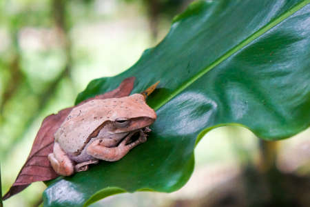 Grey little frog on tropical leaf. lisbon oceanarium.
