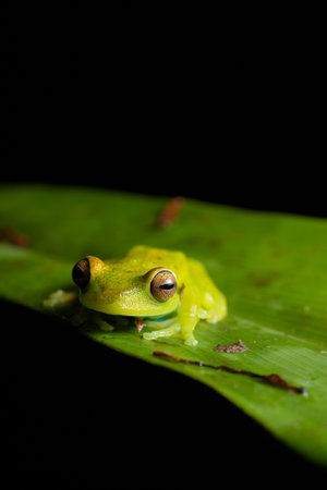 A bright green centrolenidae, glass frog with yellow dots rests on a leaf in Cuyabeno Reserve, Ecuador's Amazon Rainforest
