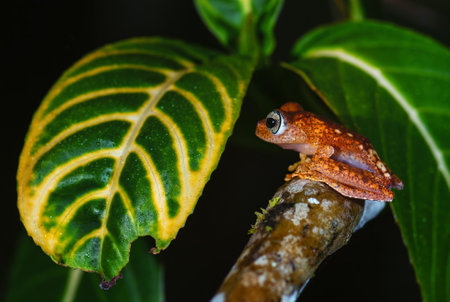 File-eared tree frog or bony-headed flying frog (Polypedates otilophus) hiding on a leaf.