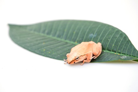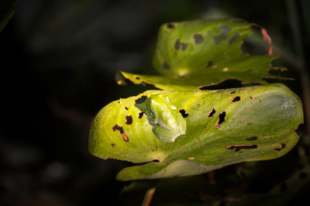Polypedates, Sleeping on a green banana leaf.Green light reflected (focus eye close-up)