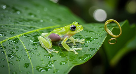 Small green frog on a leaf in the Amazon rain forest in Peru