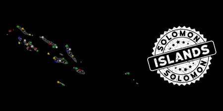Bright mesh Solomon Islands map with glare effect, and stamp. Wire frame triangular Solomon Islands map mesh in vector format on a black background. White round seal with scratched surface.