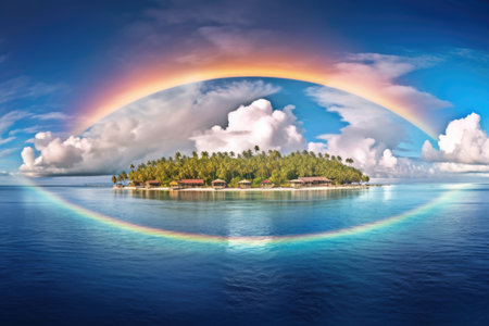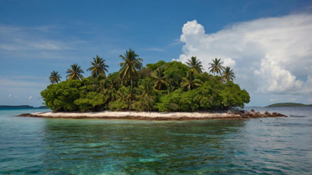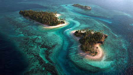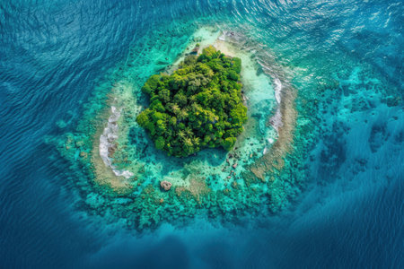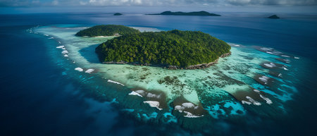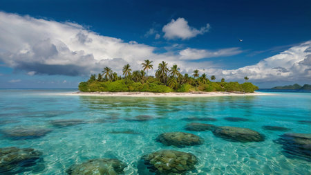 Secluded tropical island oasis surrounded by pristine azure waters and vibrant coral reefs.