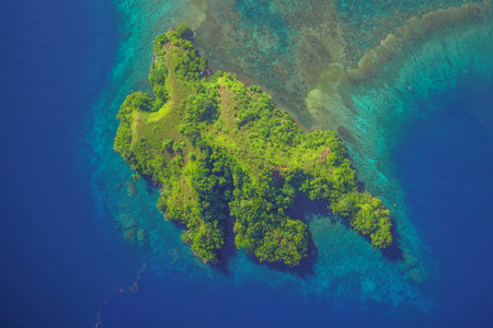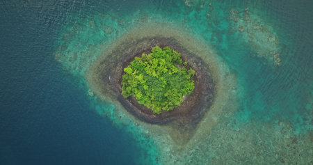 Fiji islands: Breathtaking aerial view capturing a lush tropical island surrounded by vibrant coral reefs in Fijis crystal clear turquoise waters. Wild nature travel landscape. Drone flight