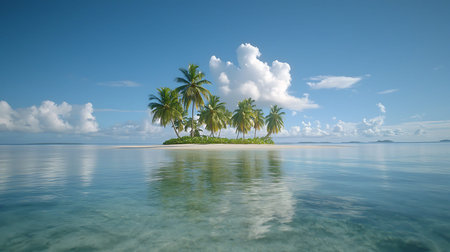 A tranquil tropical island with lush palm trees, surrounded by crystal-clear blue waters, under a serene sky.