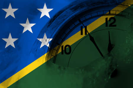 Solomon Islands flag with clock close to midnight in the background. Happy New Year concept