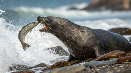 seal with a fish in its mouth on the coast of the ocean