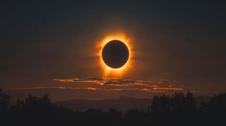 The solar eclipse casts a shadow over the mountains as the sun's corona glows brightly against the twilight sky, creating a stunning contrast with the darkened landscape below.