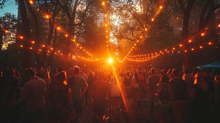 A vibrant scene of people walking beneath picturesque hanging string lights during a stunning sunset, creating an enchanting atmosphere among tall trees in an urban outdoor setting.