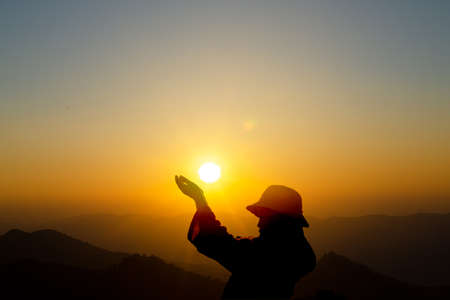 Hand of a man against the background of a beautiful sunset. The concept of freedom and hope.