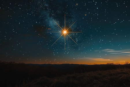 A brilliant star casts a warm glow over mountainous terrain at dusk, creating a striking contrast against the darkening sky, captivating the sense of wonder in the cosmos.