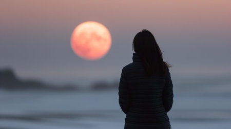 A woman gazes at a vibrant sunset illuminating the sky in shades of orange and pink, while standing on a serene beach shore, reflecting on the day as waves gently lap at her feet.