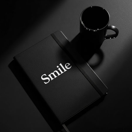 A black notebook and a mug are set on a dark surface in this image. The word Smile is displayed on the notebook's cover. The composition uses shadows and overhead lighting, creating contrast. This image could be used for various purposes, including editorial, print, or online content.
