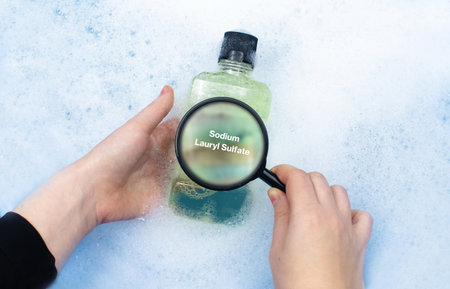 Mouthwash floating in soapy water. Harmful composition of ingredients. Rinse aid with Fluoride. The concept of hazardous substances in cosmetics and household chemicals