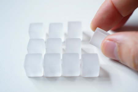 Index finger placing cube. Clear cubes arrangement. Detail oriented idea.