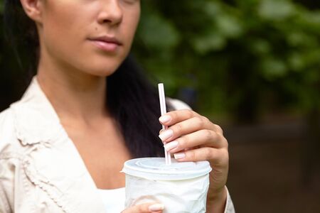 Asian girl with purple drinks water from a plastic bottle on a white isolated background. Generation Z. The concept of thirst