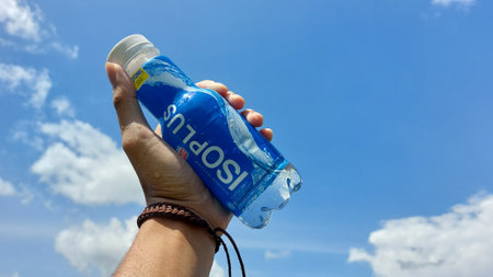 two hands of human sending and receiving the empty plastic drinking water bottle with cloudy bluesky background. concept for helping to reduce using plastic bottles to save the environment.