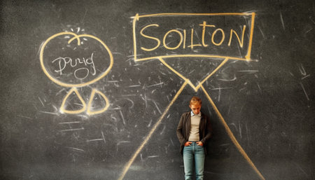 A vibrant chalkboard wall bursts with creativity, featuring the word Problem in striking red surrounded by playful doodles and colorful illustrations. This lively backdrop inspires innovative thinking and problem-solving, making it perfect for brainstorming sessions or creative workshops.