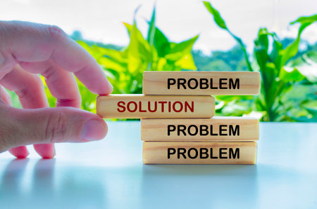 Hand putting Solution text on wooden blocks with other blocks with Problems.