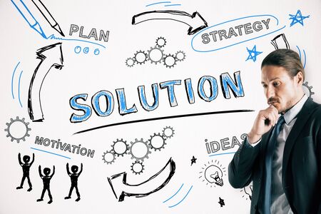 Solution, finance and marketing concept. Businessman drawing creative business sketch on white background