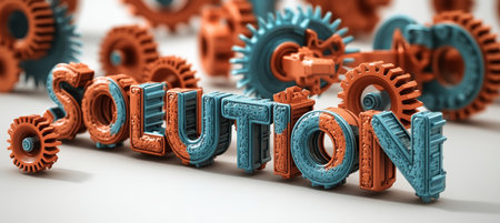 Solution spelled in vibrant orange and teal gears and cogs on white background, studio shot