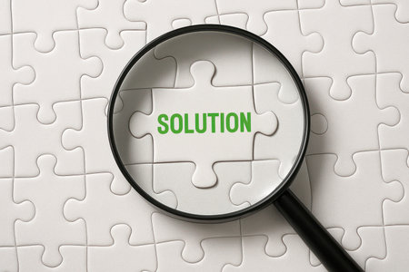 A magnifying glass zooms in on a puzzle piece labeled 'solution,' symbolizing clarity in problem-solving.