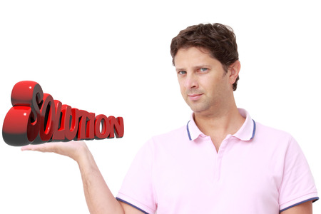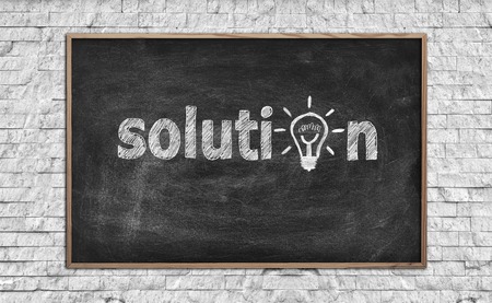 Two hands hold a row of white blocks with blue letters spelling out the word SOLUTION, representing finding an answer.