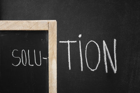 Word Solution from wooden blocks on blue wooden boards with copy space, top view. Conceptual of business, education and innovation. Word Solution written in chalk on black wooden cubes, flat lay.