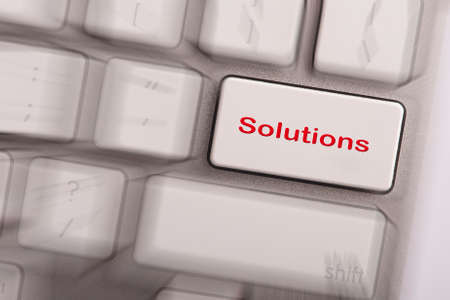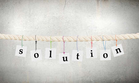 Solutions, word in wooden alphabet letters isolated on purple background as banner headline