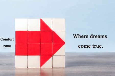 Mosaic of cubes in the shape of an arrow. The arrow points to the inscription: Where dreams come true. On the back of the arrow is written in small letters: comfort Zone.