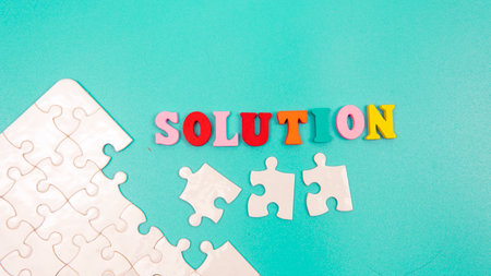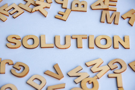 Solution text formed with wooden letters on white background representing problem solving strategy and decision making concept
