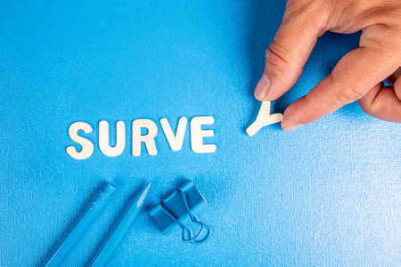 Survey concept. Text from white wooden letters on a blue background