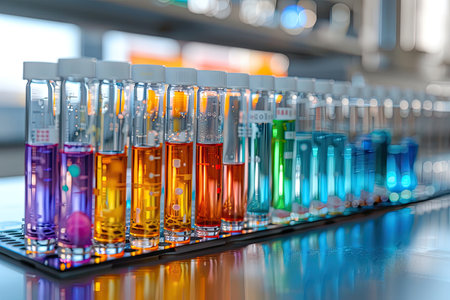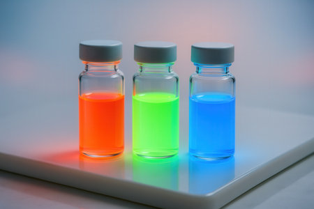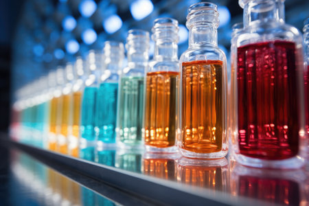 A series of glass vials displaying vibrant liquids in a laboratory setting, showing different colors.