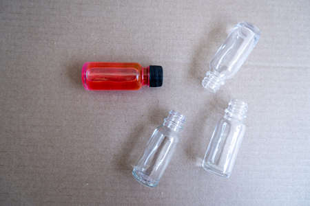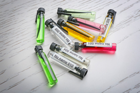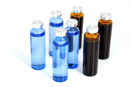Liquid samples in lab containing medicine in glass vials and ampoules