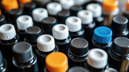 Medicine bottles of different colors and sizes in a medical laboratory.