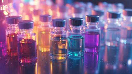 Vibrant glass medical vials with colorful liquids illuminated by a light beam reflecting on a marble surface against a dark black background today.